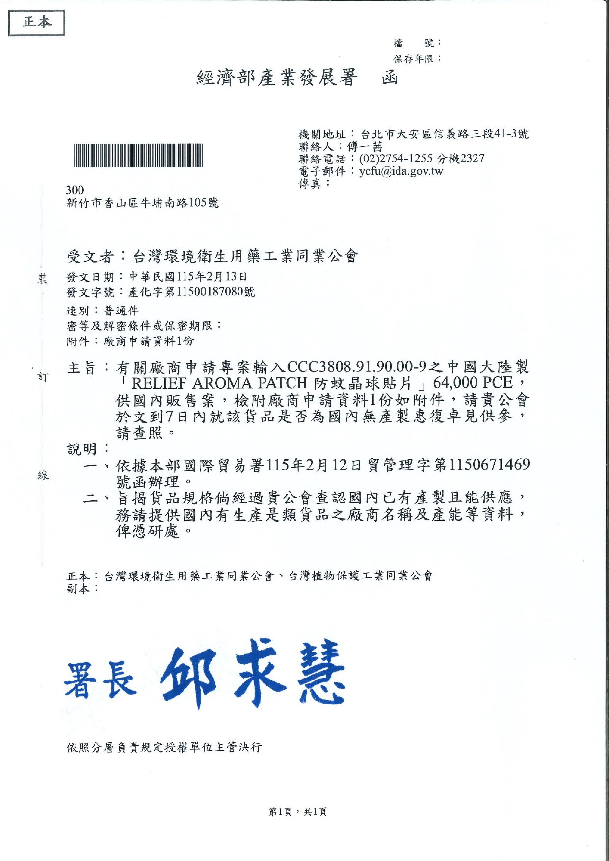 0213_經濟部產發署_產化字第11500187080號_廠商申請專案輸入大陸製防蚊晶球貼片徵詢產製意見4