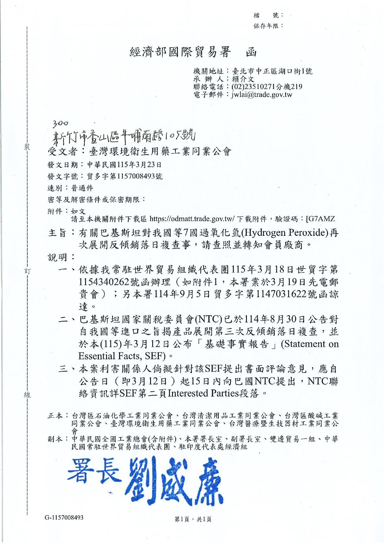 0323_經濟部國際貿易署_貿多字第1157008493號_巴基斯坦對我國過氧化氫反傾銷落日複查4